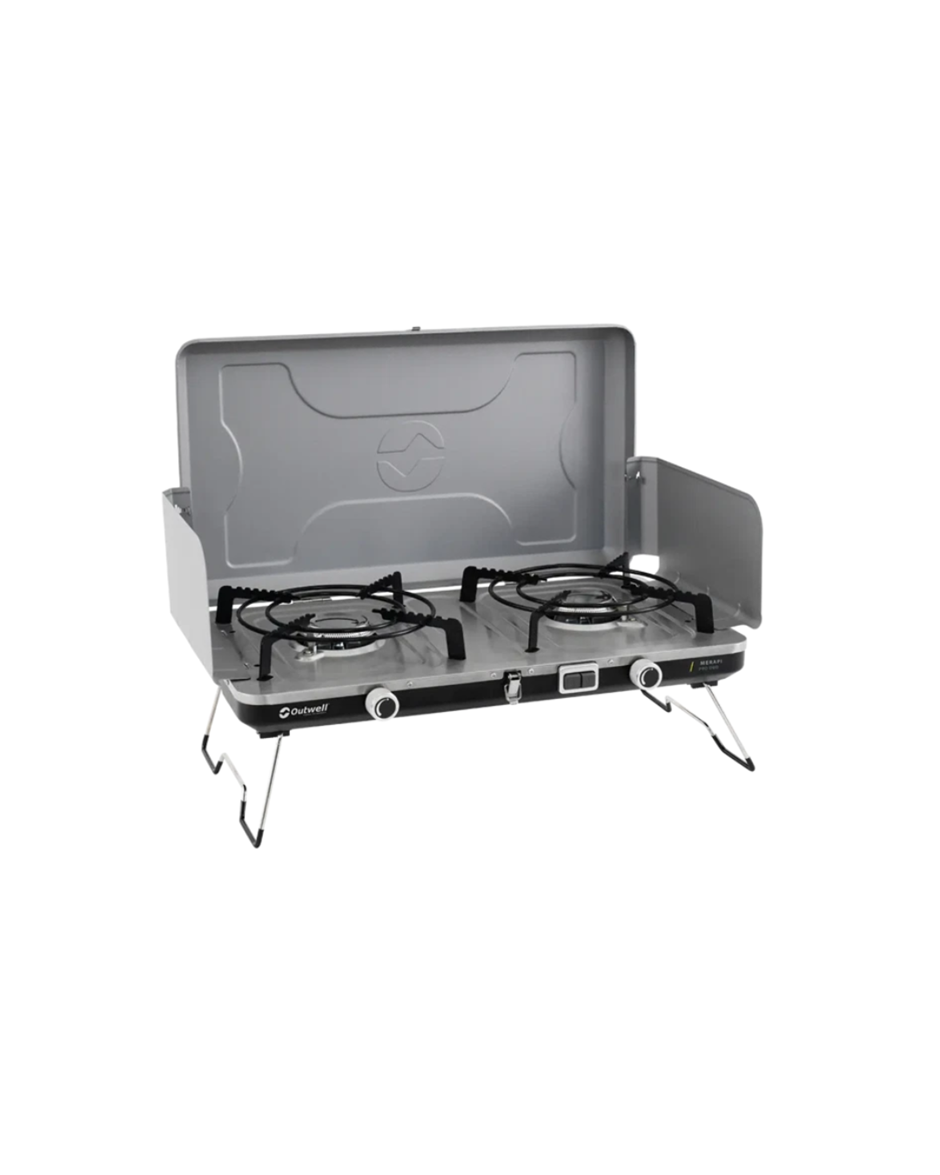 The Outwell Merapi Pro Duo Deluxe Gas Stove is a sophisticated model designed to fulfil the needs of outdoor cooking enthusiasts. The robust construction features large, removable enamel-coated steel pot supports to accommodate an array of culinary tools, highlighting the versatility of this appliance. At its core, the stove houses high-output stainless steel burners, fuelled by EN417 threaded self-sealing gas cartridges, providing reliable output and longevity. The individual piezo ignition system for each burner ensures a safe and efficient start while the specified heat regulators aid in maintaining optimal cooking temperature. Added convenience is noted in the form of collapsible legs that ably add to the countertop space and elevate the working height, delivering an enhanced cooking experience.