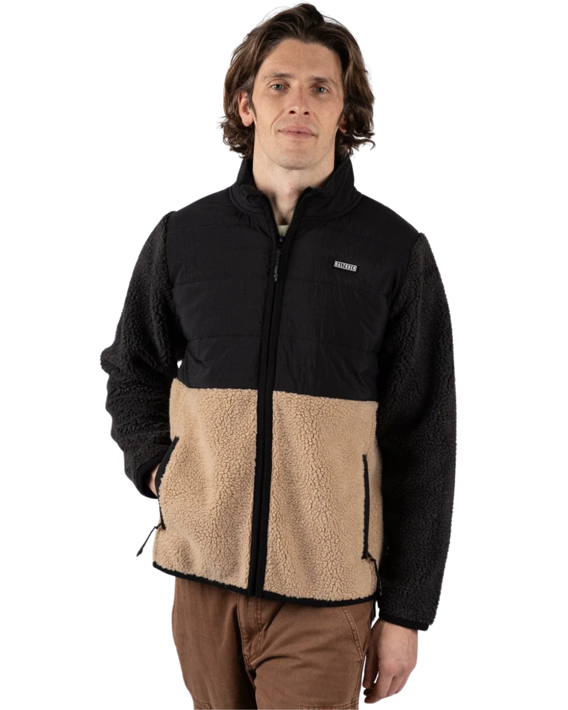 This men's zip fleece is a colour-blocked layer that earns its place in any outdoor kit. The combination of black nylon chest, black sherpa sleeves and a beige sherpa bottom panel gives it a distinctive, textured look, while the bonded jersey lining and elasticated cuffs keep the warmth locked in. Made from 100% recycled polyester, it's a fleece you can feel good about wearing on the trail, in the van, or wherever the weekend takes you.