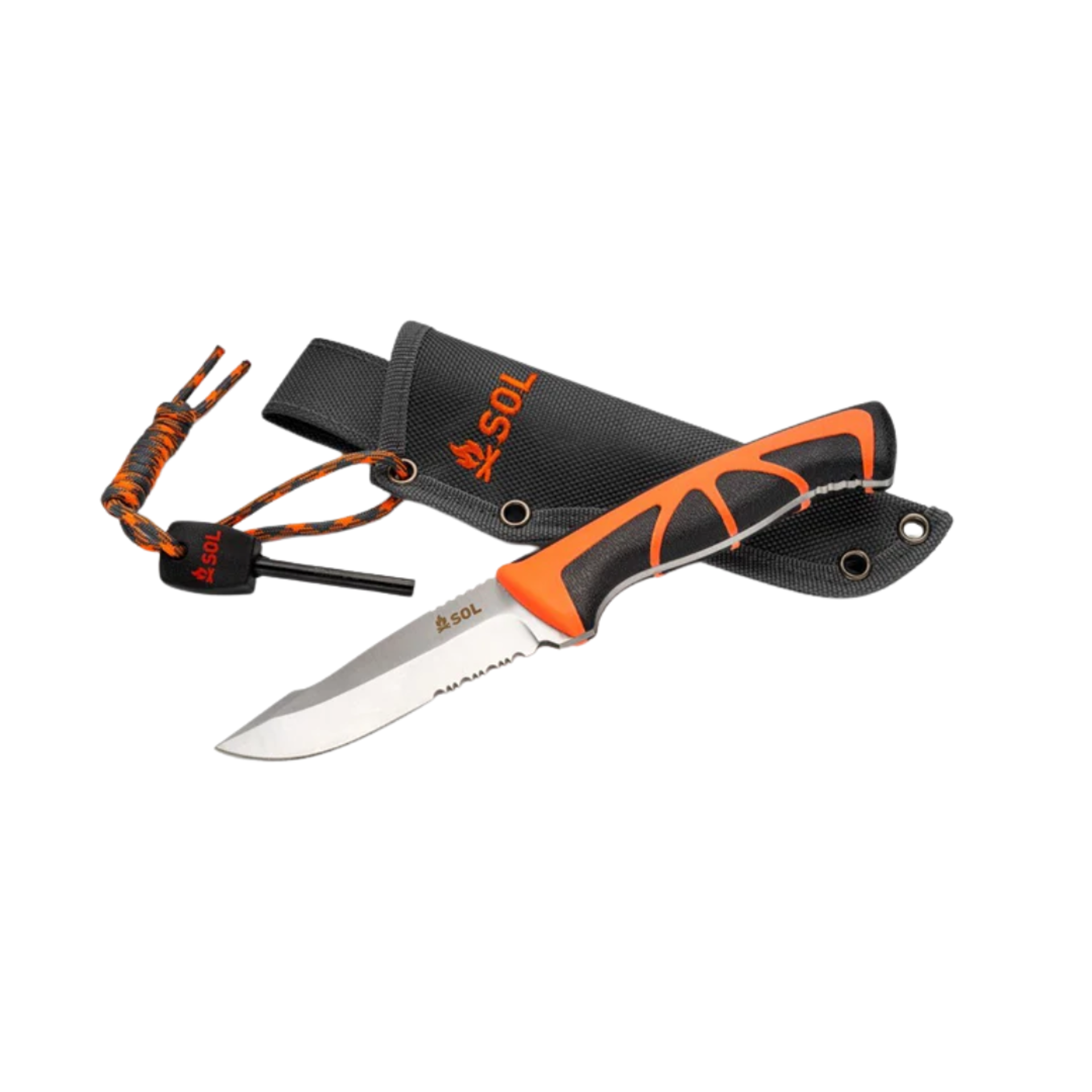 • Sturdy Holster– Riveted belt holster protects blade and provides storage for flint fire starter.