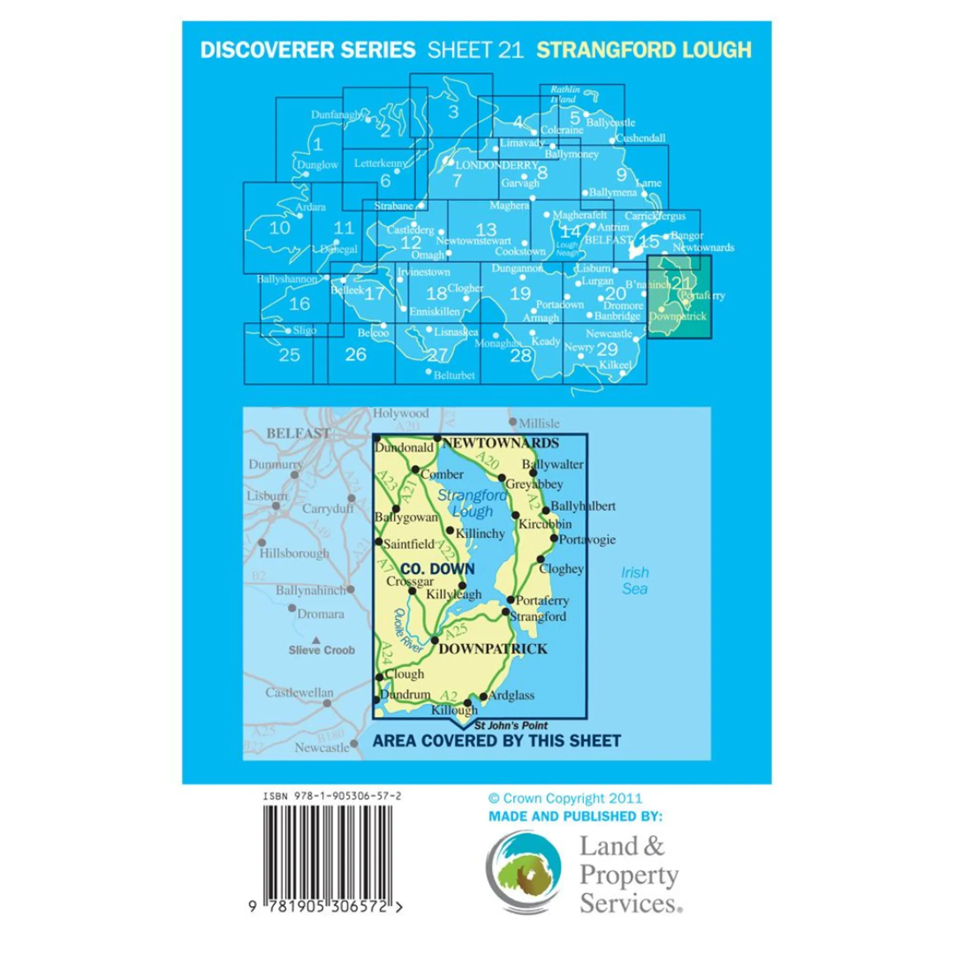 Discovery Sheet No. 21 covers County Down.  Discovery maps are produced at a scale of 1:50,000 (or 2cm on paper equals 1 kilometre on the ground). Each Discovery Sheet covers an area of 40km x 30km surface area (with the exception of several portrait-format sheets, which are 42km x 32km). This is a comprehensive series of feature-rich maps which show detailed landscape information, like rivers, lakes, contours and many townland names. The Discovery Series is designed primarily for tourist and leisure activities; these maps are the preferred choice for hill walkers and those in pursuit of the great outdoors. It is also an ideal reference for location-focussed business use, in pocket-friendly folded form or as a wall-mounted reference.